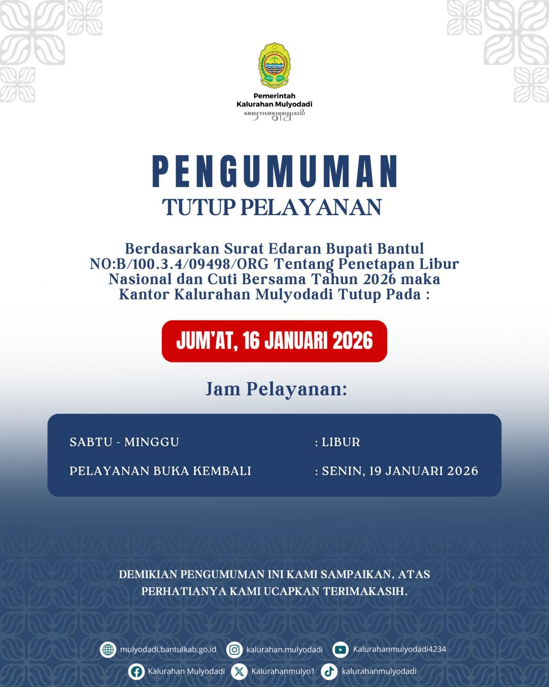 Nasional dan Cuti Bersama Tahun 2026 maka Kantor Kalurahan Mulyodadi Tutup Pada :