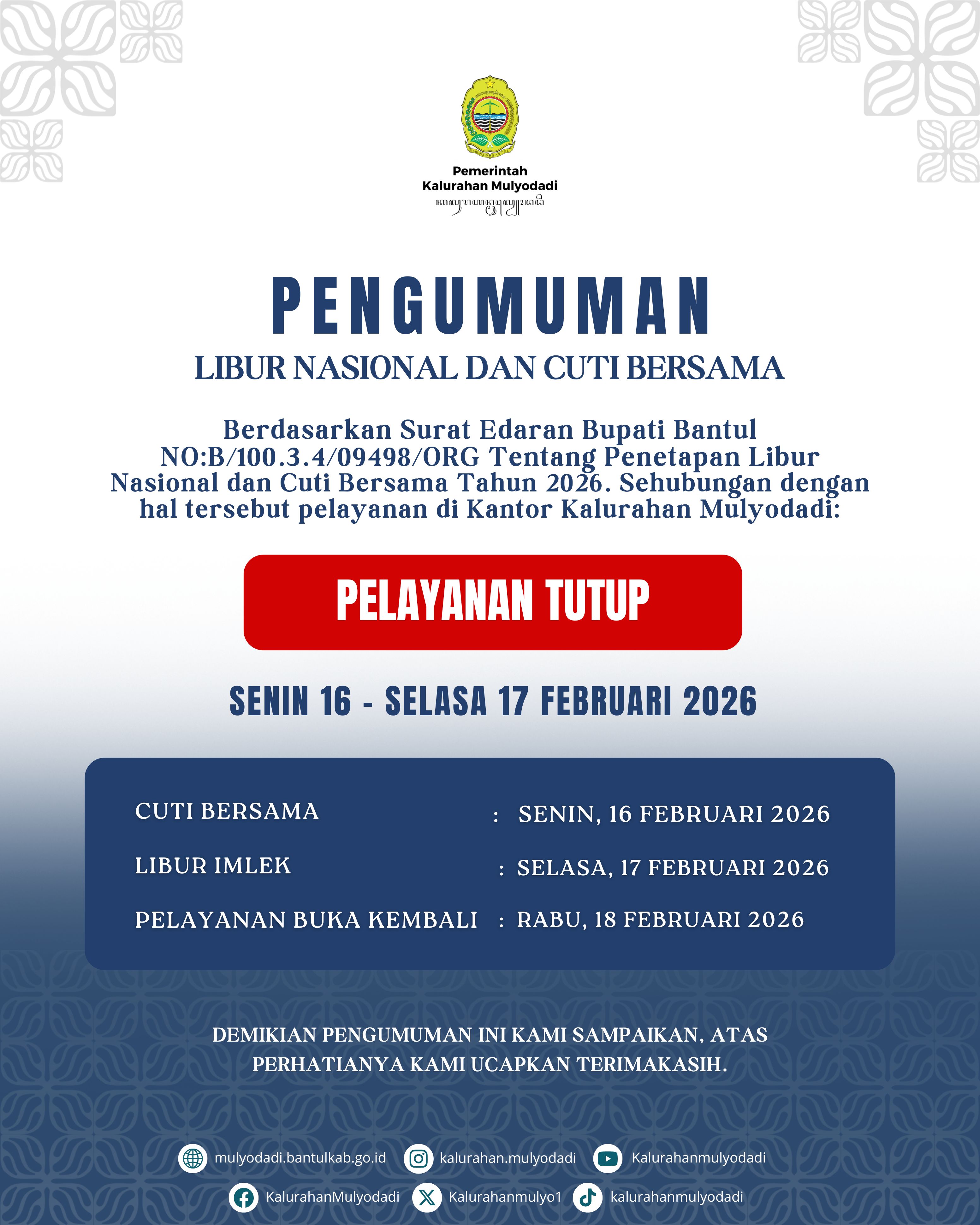 Nasional dan Cuti Bersama Tahun 2026 maka Kantor Kalurahan Mulyodadi Tutup Pada :