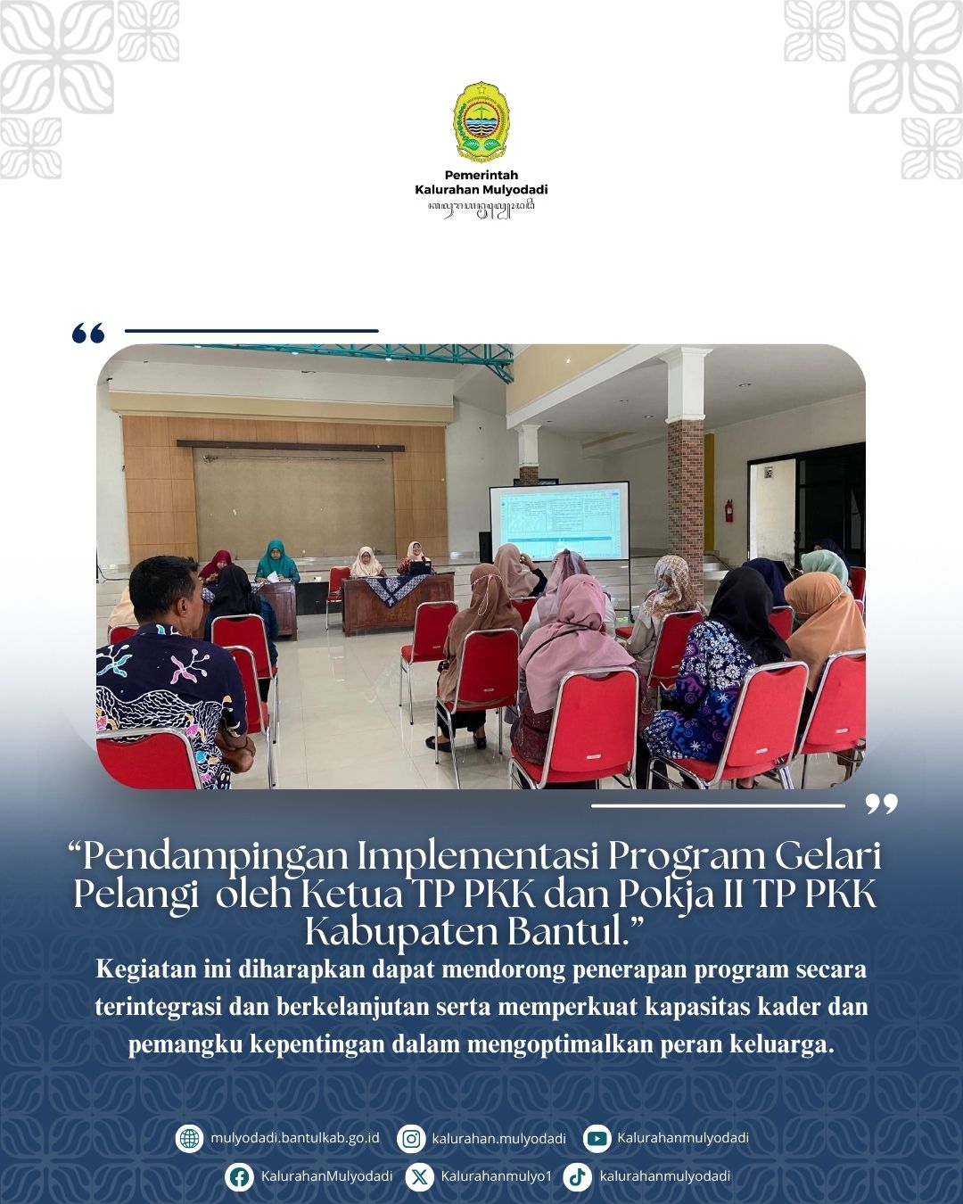 Jum'at, 27 Februari 2026 - Kegiatan ini dilaksanakan sebagai upaya memperkuat peran keluarga dalam membangun budaya gemar belajar serta penguatan karakter sejak dini. Sebagai upaya sarana berbagi pemahaman dan strategi pelaksanaan program agar dapat berjalan dengan optimal dan berkelanjutan di Kalurahan Mulyodadi.