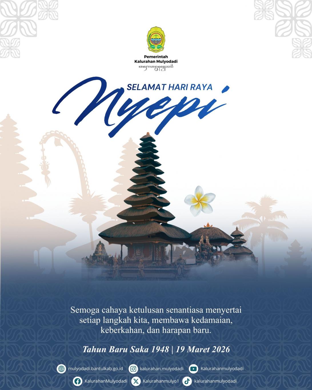 Pemerintah Kalurahan Mulyodadi mengucapkan Selamat Hari Raya Nyepi Tahun Baru Saka 1948. Semoga keheningan menjadi ruang untuk membersihkan pikiran, menenangkan hati, dan memperkuat harmoni dengan sesama serta alam semesta.