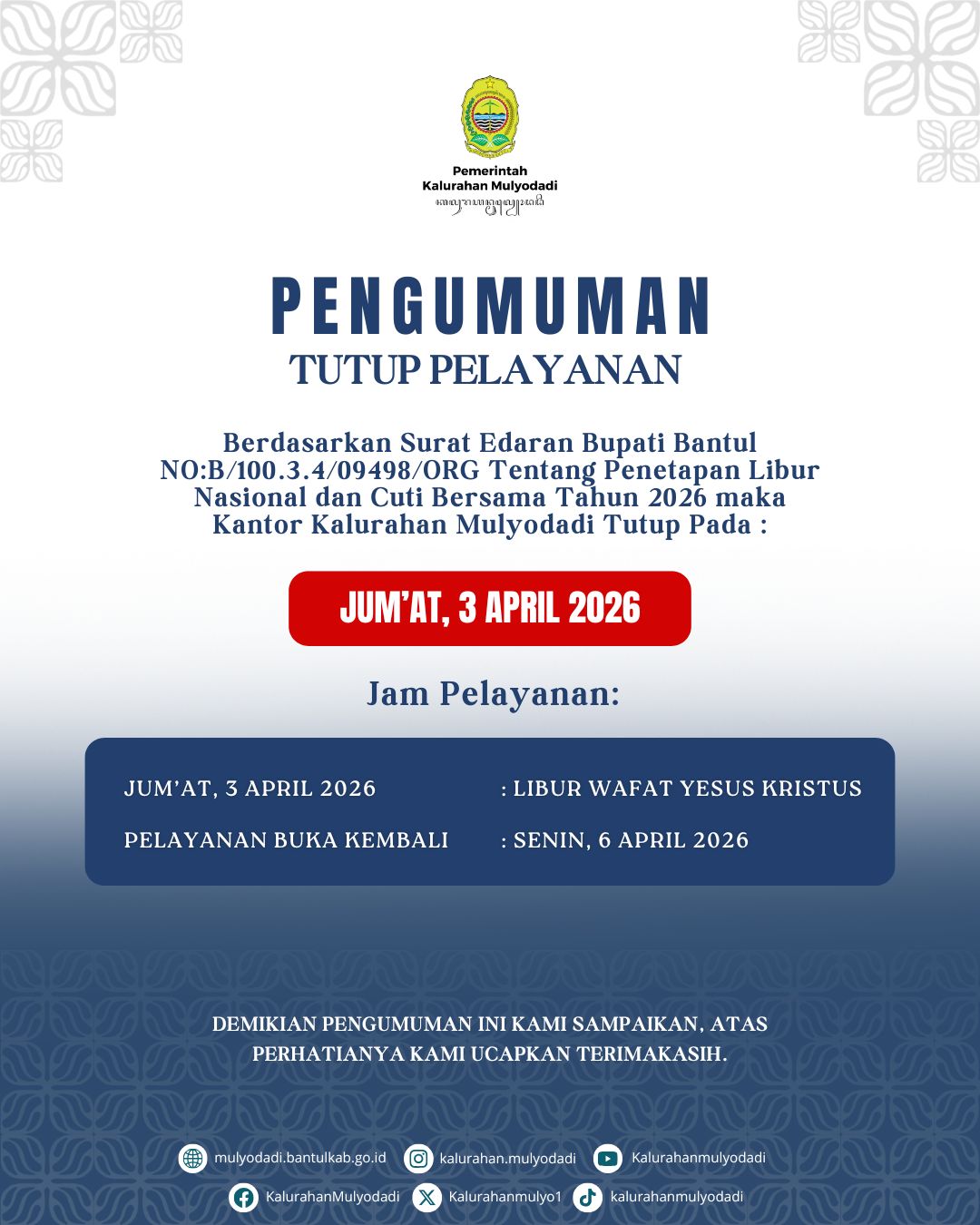 Nasional dan Cuti Bersama Tahun 2026 maka Kantor Kalurahan Mulyodadi Tutup Pada :