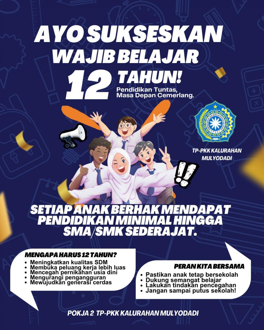 Pemerintah Kalurahan Mulyodadi mengajak seluruh masyarakat untuk bersama mendukung Program Wajib Belajar 12 Tahun. Setiap anak berhak mendapatkan pendidikan yang layak sebagai bekal utama dalam meraih masa depan yang lebih baik.